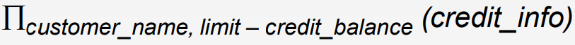 El atributo resultante de la expresión límite - saldo-crédito no tiene un nombre. Se puede aplicar la operación renombramiento al resultado de la proyección generalizada para darle un nombre. Como conveniencia notacional, el renombramiento de atributos se puede combinar con la proyección generalizada como se ilustra a continuación: