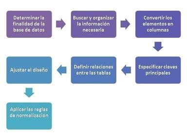 El proceso de diseño para una base de datos consta básicamente de 7 pasos, los cuáles se describen en la siguiente imagen.